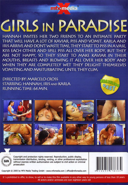 Ханна пригласила двух своих подруг на развратную вечеринку, в программе которой ожидается много копро, писсинг и блевотина. Как только Карла и Ирис приехали они сразу принялись за дело, пописали в вазу, начали целоваться и обоссали друг-дружку. Но это было только начало, далее они начали срать в рот, на грудь, кушать и размазывать какашки по телу. Изрядно наевшись дерма их начало подташнивать и девушки принялись рыгать друг на дружку, жадно поедая блевотину.