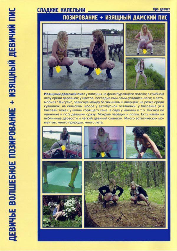 Даже в далекой русской глубинке нашлись настоящие любительницы писсинга и именно о них этот порно фильм. Девушки, отдыхая на природе, не прочь порезвиться немного, показать свои прелести и устроить небольшой писсинг марафон. Дуэтный писс на набережной, в поле, на трассе и даже на крыше автомобиля. То ли еще будет, стоит только красоткам войти в раж. Эти развратные, похотливые ссыкушки вряд ли быстро угомонятся, крошкам хочется еще и еще, и отказывать себе в этом удовольствии они не намерены.